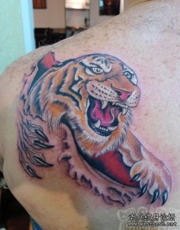 肩部彩色撕皮老虎纹身图案纹身图片_肩部纹身图案大全_纹身图吧