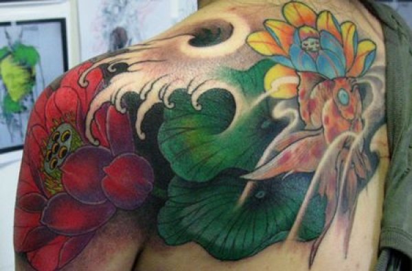 肩部彩色莲花荷叶金鱼纹身图案纹身图片_肩部纹身图案大全_纹身图吧