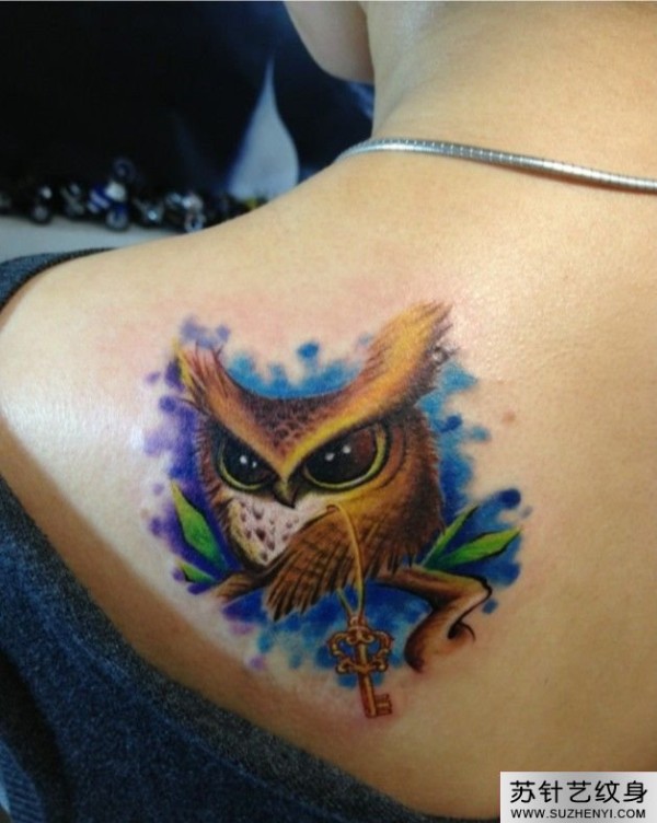 后肩猫头鹰叼金钥匙刺青_肩部纹身图案大全_纹身图吧