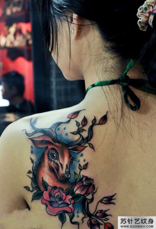 肩部彩色鹿与花纹身_肩部纹身图案大全_纹身图吧