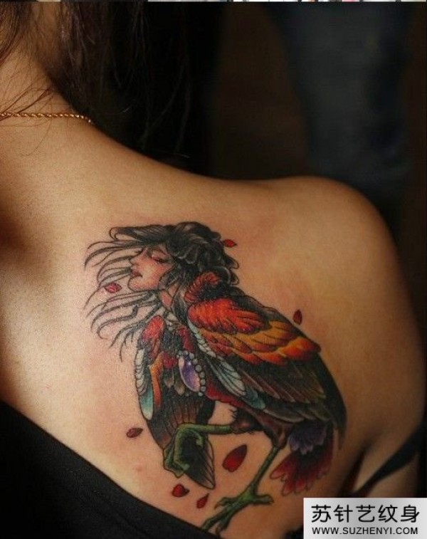 香肩美女头像鸟纹身_肩部纹身图案大全_纹身图吧