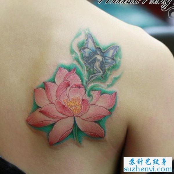 肩部彩色莲花精灵纹身_肩部纹身图案大全_纹身图吧
