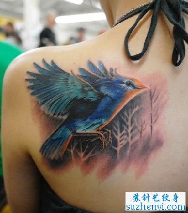 肩背彩色小鸟纹身_肩部纹身图案大全_纹身图吧