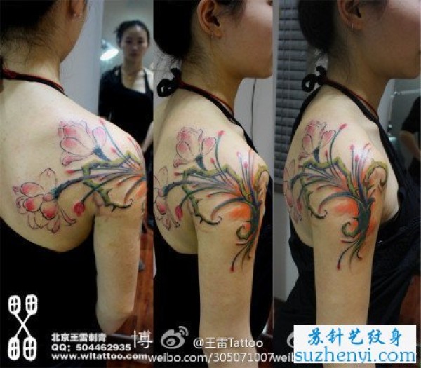 手臂到肩背彩色花卉纹身_肩部纹身图案大全_纹身图吧