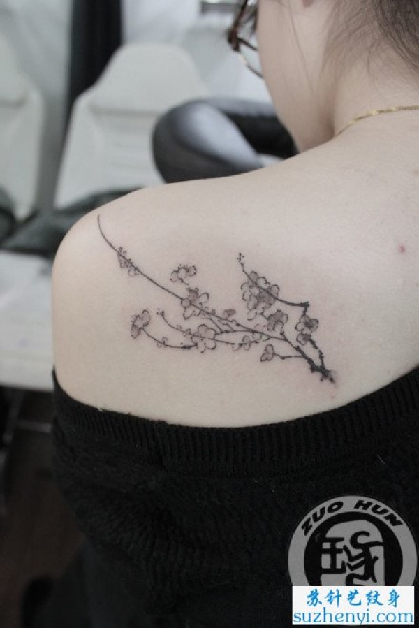 肩背唯美好看的水墨梅花纹身_肩部纹身图案大全_纹身图吧