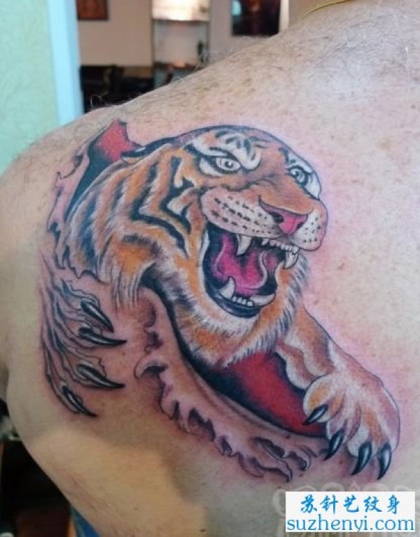 肩部彩色撕皮老虎纹身_肩部纹身图案大全_纹身图吧