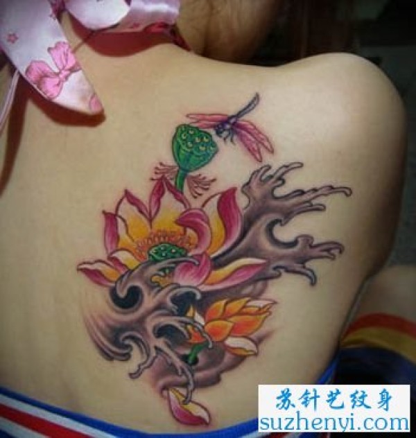 肩部彩色蜻蜓莲花纹身_肩部纹身图案大全_纹身图吧