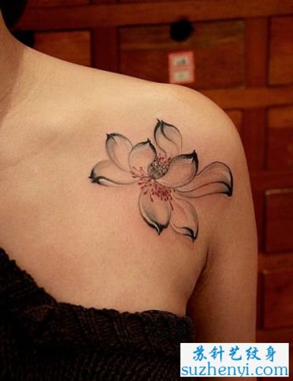肩部水墨风格莲花纹身_肩部纹身图案大全_纹身图吧