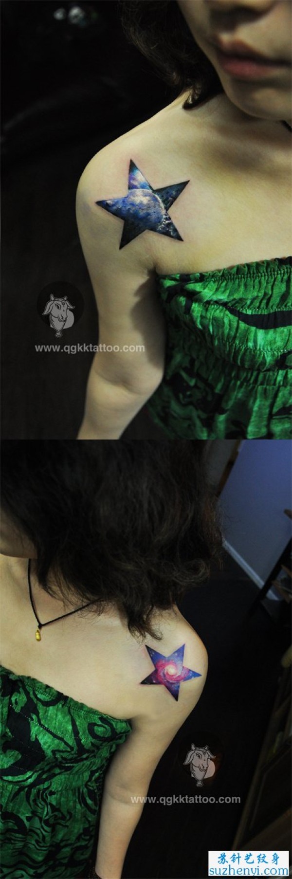 肩膀处彩色星空五角星纹身_肩部纹身图案大全_纹身图吧