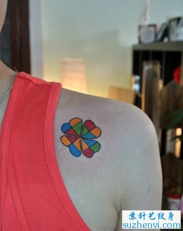 肩膀处小巧的彩色四叶草纹身_肩部纹身图案大全_纹身图吧