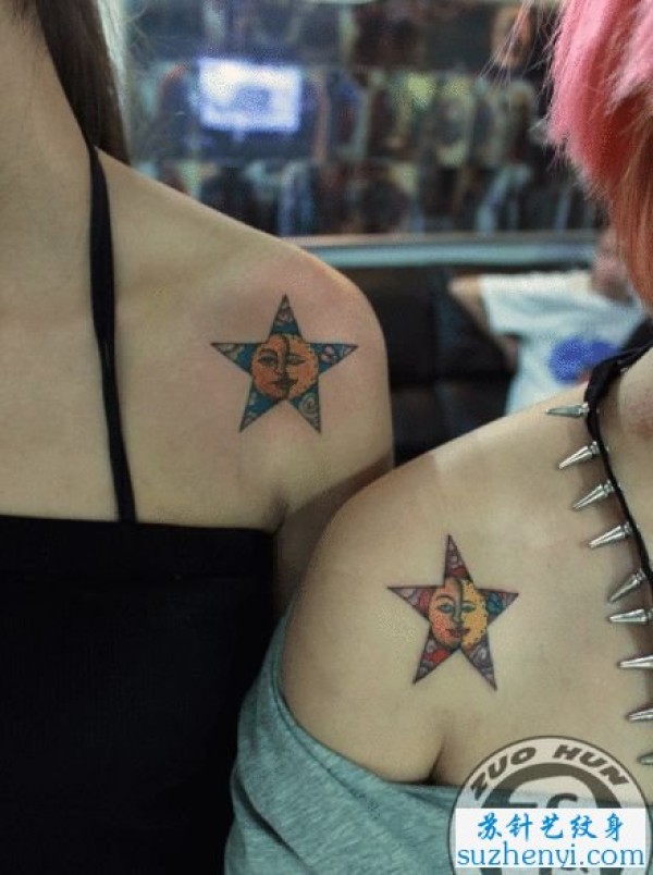 肩膀处五角星太阳与月亮纹身_肩部纹身图案大全_纹身图吧