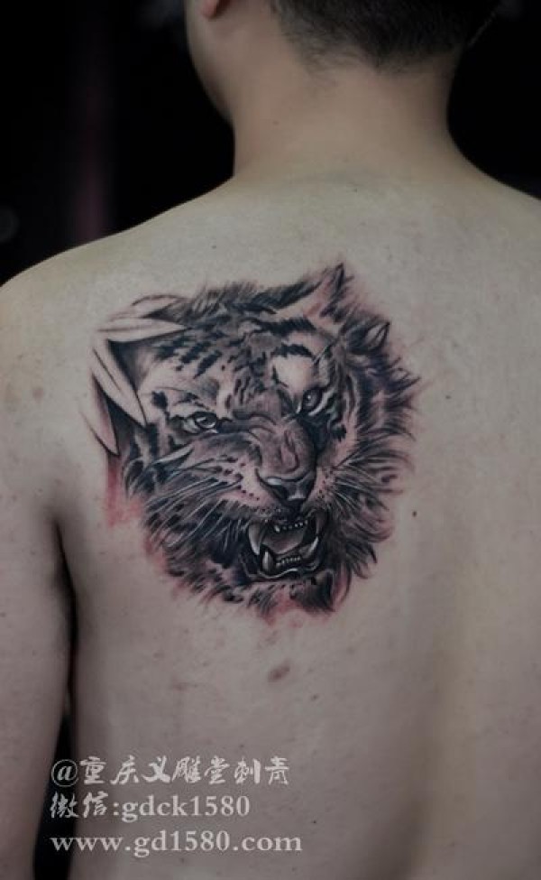 后肩老虎头纹身黑灰系列_肩部纹身图案大全_纹身图吧