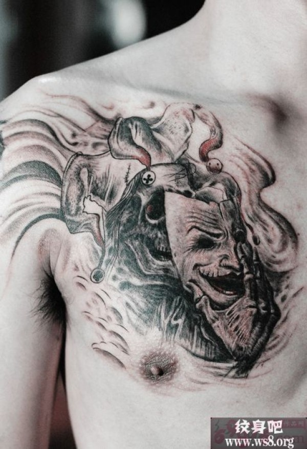 创意骷髅小丑面具胸口纹身图案_骷髅纹身图案大全_纹身图吧