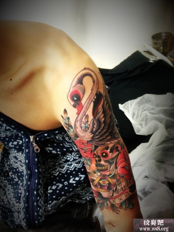 天鹅骷髅花臂个性纹身图案_骷髅纹身图案大全_纹身图吧