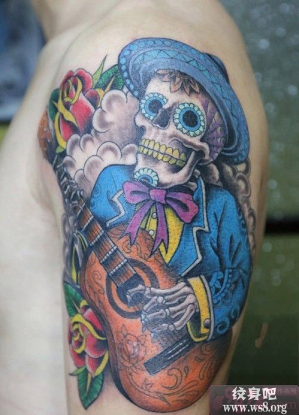 骷髅人弹吉他个性手臂纹身图案_骷髅纹身图案大全_纹身图吧