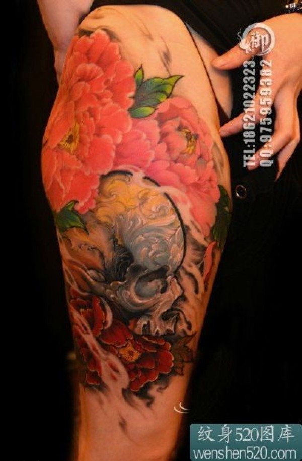 腿部彩色骷髅牡丹花纹身图案_骷髅纹身图案大全_纹身图吧