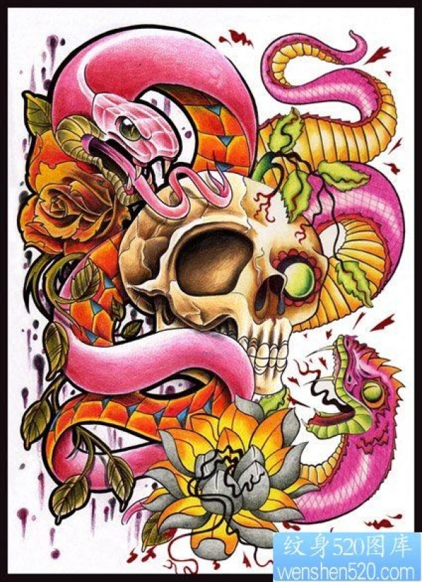 彩色骷髅蛇纹身图案_骷髅纹身图案大全_纹身图吧