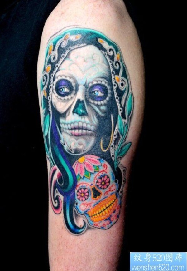 一款手臂欧美彩色骷髅纹身图案_骷髅纹身图案大全_纹身图吧
