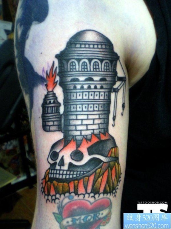 胳膊个性骷髅头高塔纹身图案_骷髅纹身图案大全_纹身图吧