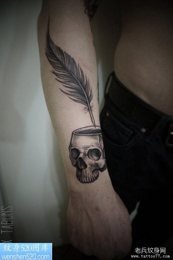 手臂个性骷髅头羽毛纹身作品_骷髅纹身图案大全_纹身图吧