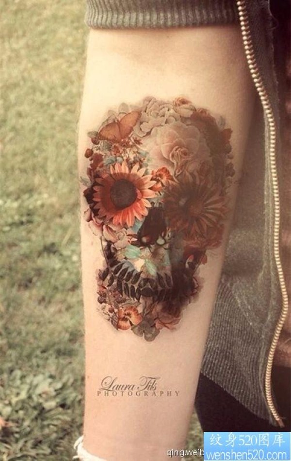 手臂骷髅菊花纹身_骷髅纹身图案大全_纹身图吧