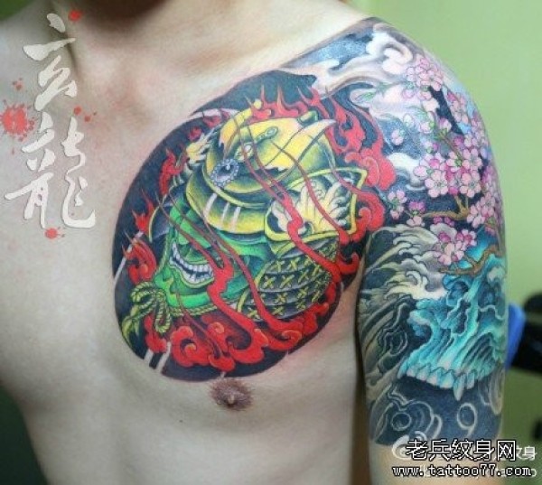 一幅时尚经典的半胛日本武士与骷髅纹身图片_骷髅纹身图案大全_纹身图吧