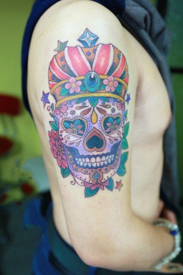 男人手臂多彩骷髅皇冠纹身图案_骷髅纹身图案大全_纹身图吧