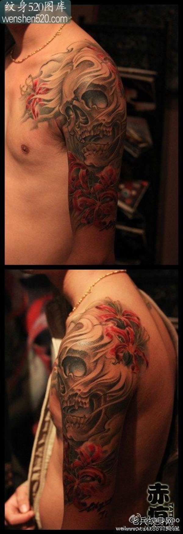 男生手臂经典的骷髅与彼岸花纹身图案_骷髅纹身图案大全_纹身图吧