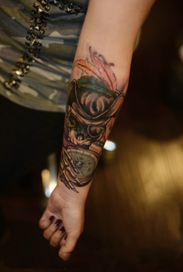 复古黑灰骷髅怀表纹身图案_骷髅纹身图案大全_纹身图吧