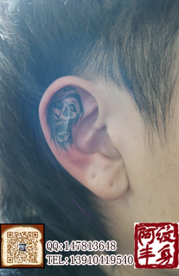 耳郭上的骷髅头纹身图这款纹身感觉蛮恐怖的,_骷髅纹身图案大全_纹身图吧