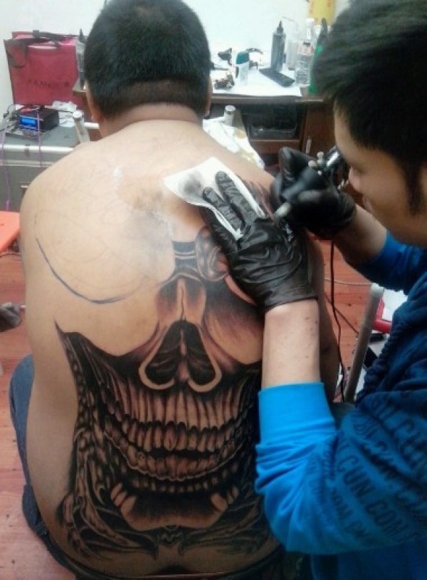 后背巨型未完成骷髅头纹身纹身都是精雕细琢的_骷髅纹身图案大全_纹身图吧