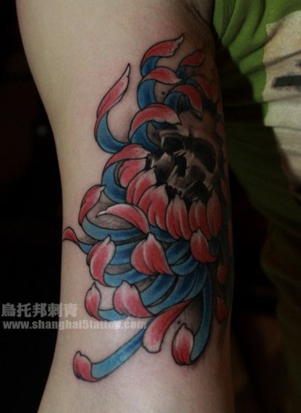 手臂好看经典的骷髅菊花纹身图案_骷髅纹身图案大全_纹身图吧