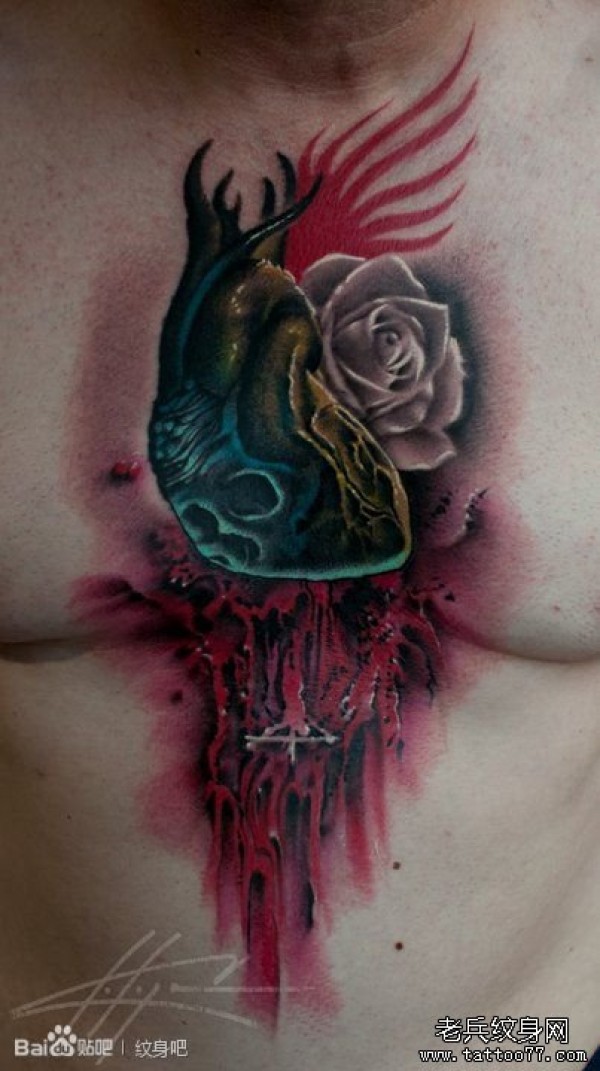男人前胸超酷的一款骷髅心脏纹身图案_骷髅纹身图案大全_纹身图吧