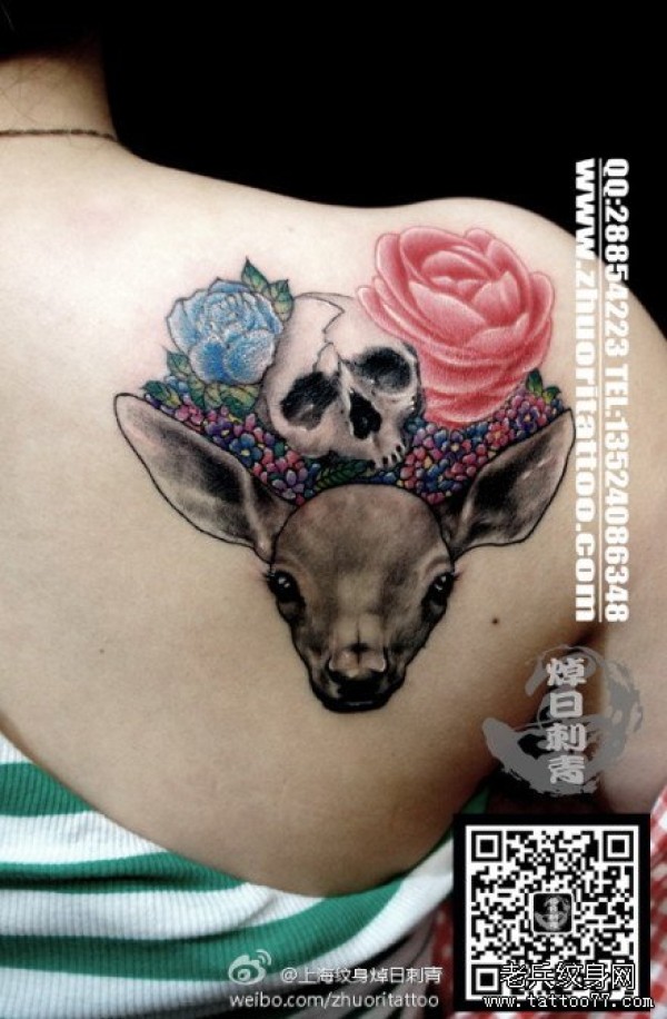 美女肩背唯美潮流的小鹿骷髅纹身图案_骷髅纹身图案大全_纹身图吧