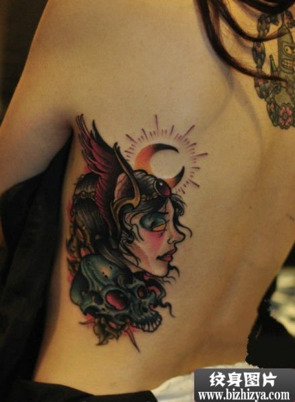 欧美风骷髅美女头像腰部纹身图案图片_骷髅纹身图案大全_纹身图吧