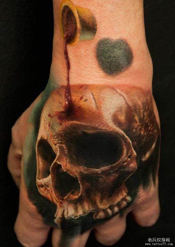 手背上一款霸气的彩色骷髅纹身图案_骷髅纹身图案大全_纹身图吧