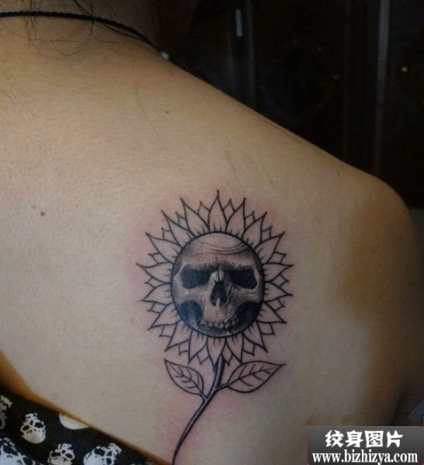 骷髅向日葵个性肩部纹身图案图片_骷髅纹身图案大全_纹身图吧