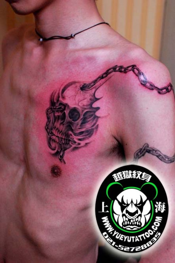 胸部骷髅锁链纹身图案上海越狱纹身店作品_骷髅纹身图案大全_纹身图吧