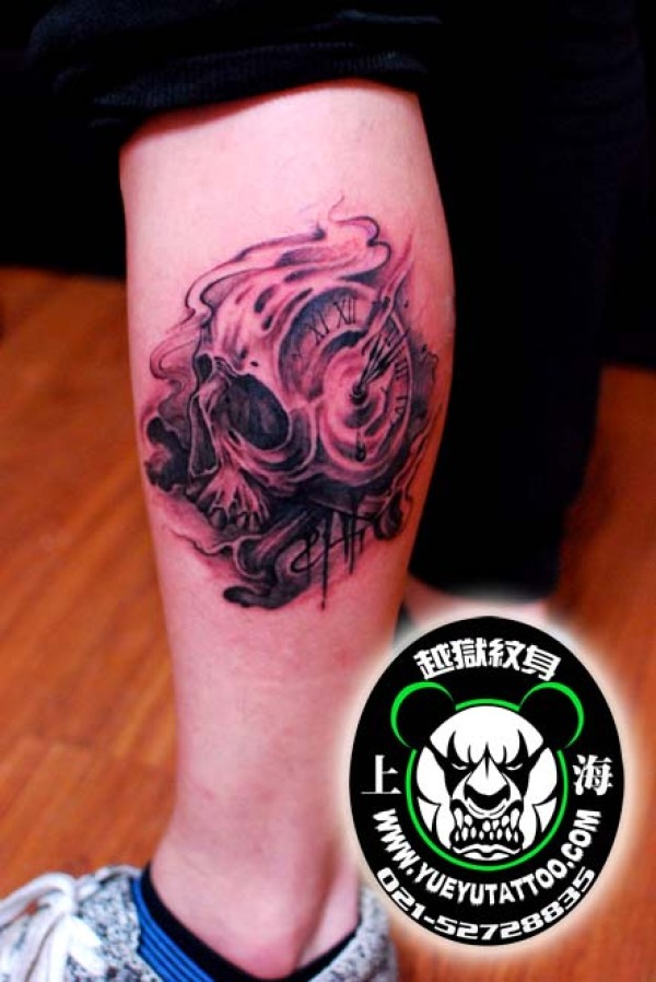 腿部时钟骷髅纹身图案上海越狱纹身店作品_骷髅纹身图案大全_纹身图吧