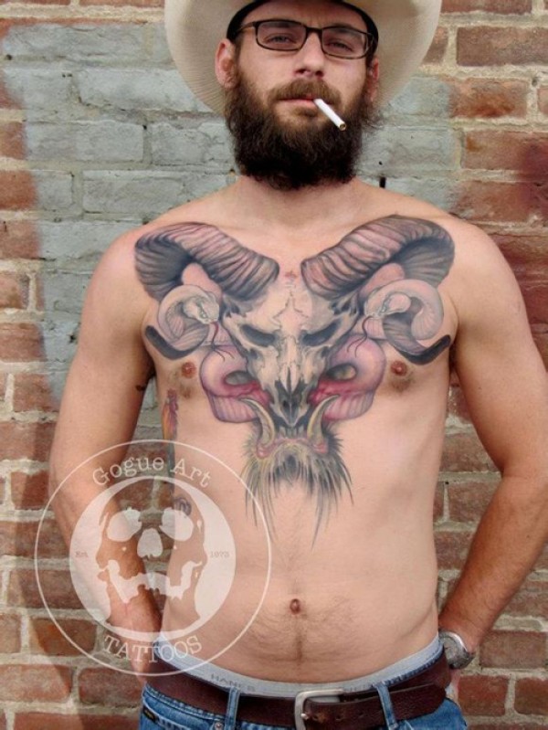 男人前胸超帅很酷的羊头骷髅纹身图案_骷髅纹身图案大全_纹身图吧