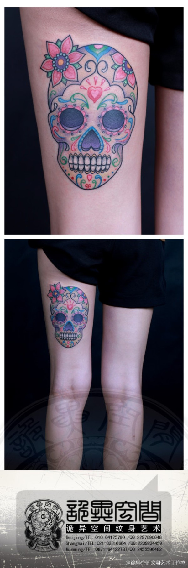 女生腿部潮流精美的欧美花骷髅纹身图案_骷髅纹身图案大全_纹身图吧