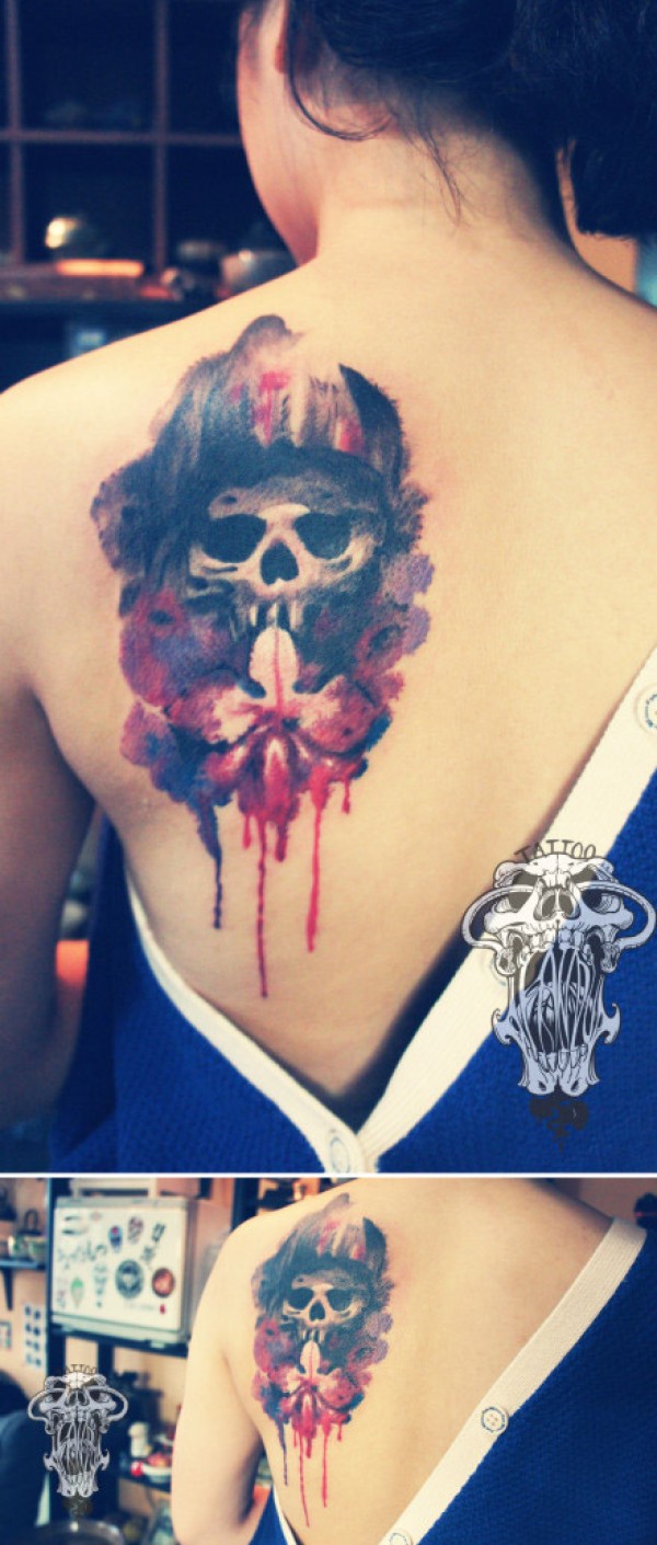 女生肩背时尚经典的骷髅与兰花纹身图案_骷髅纹身图案大全_纹身图吧