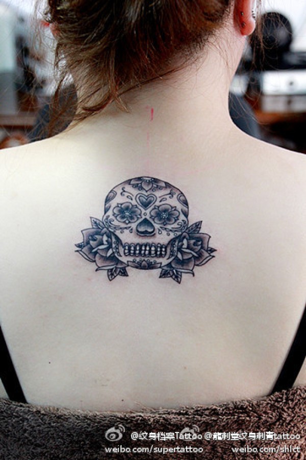 女生后背时尚潮流的黑灰骷髅纹身图案_骷髅纹身图案大全_纹身图吧