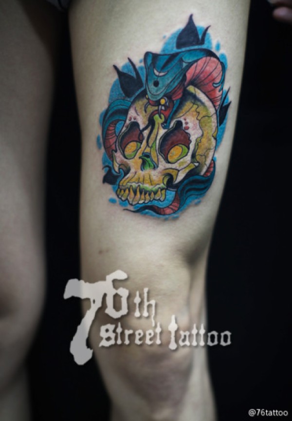 美女腿部经典时尚的彩色骷髅纹身图案_骷髅纹身图案大全_纹身图吧