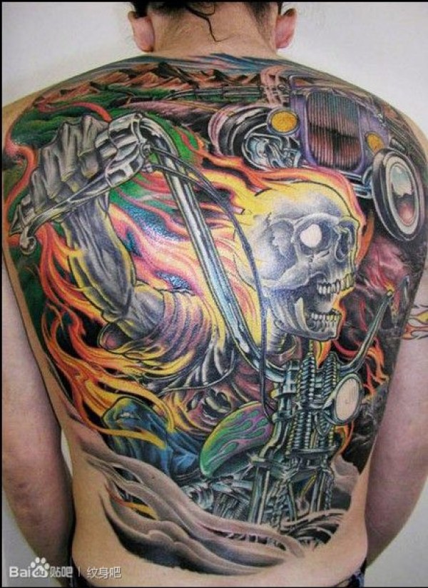 男人后背很酷的骑摩托的骷髅纹身图案_骷髅纹身图案大全_纹身图吧