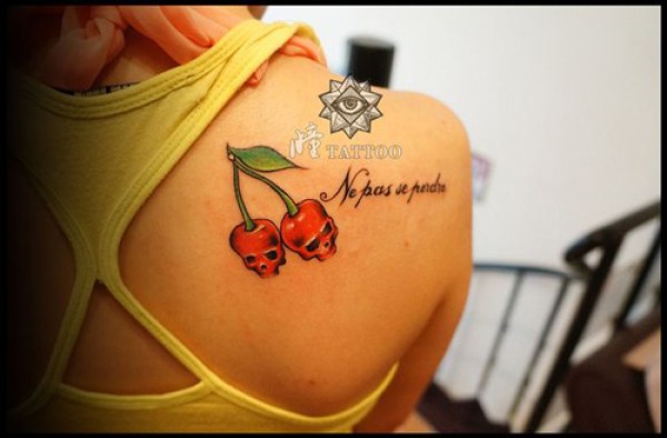 女生后肩背小巧的骷髅樱桃纹身图案_骷髅纹身图案大全_纹身图吧