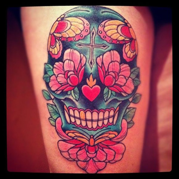 腿部潮流很酷的欧美花骷髅纹身图案_骷髅纹身图案大全_纹身图吧