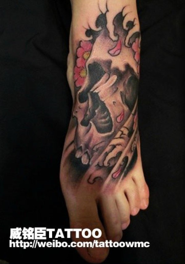 女生脚背经典潮流的骷髅纹身图案_骷髅纹身图案大全_纹身图吧