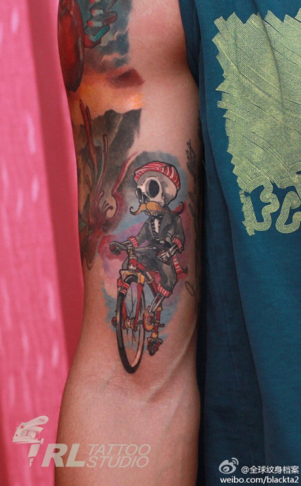 手臂经典的起自行车的骷髅纹身图案_骷髅纹身图案大全_纹身图吧