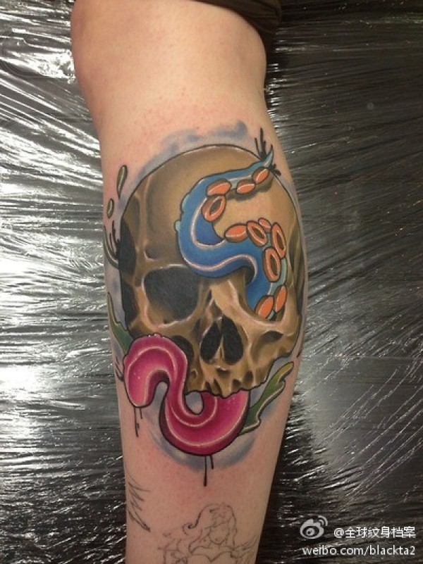 腿部潮流帅气的欧美彩色骷髅纹身图案_骷髅纹身图案大全_纹身图吧